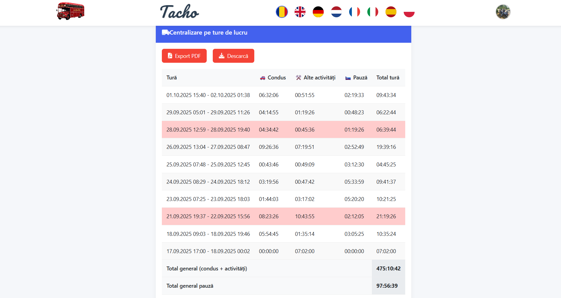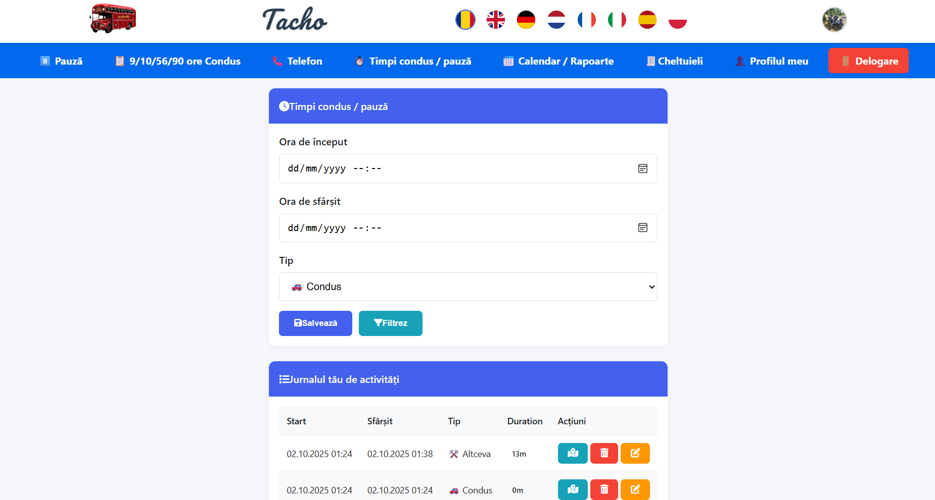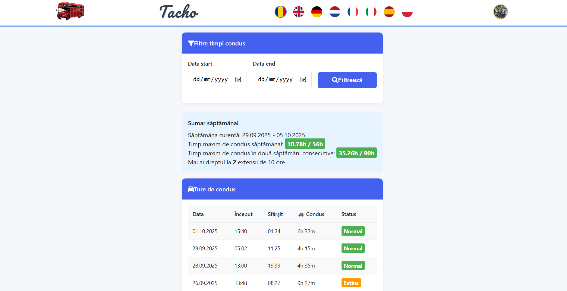 Această aplicație este destinată șoferilor profesioniști și companiilor de transport care doresc să gestioneze eficient timpii de condus, pauză și alte activități zilnice.