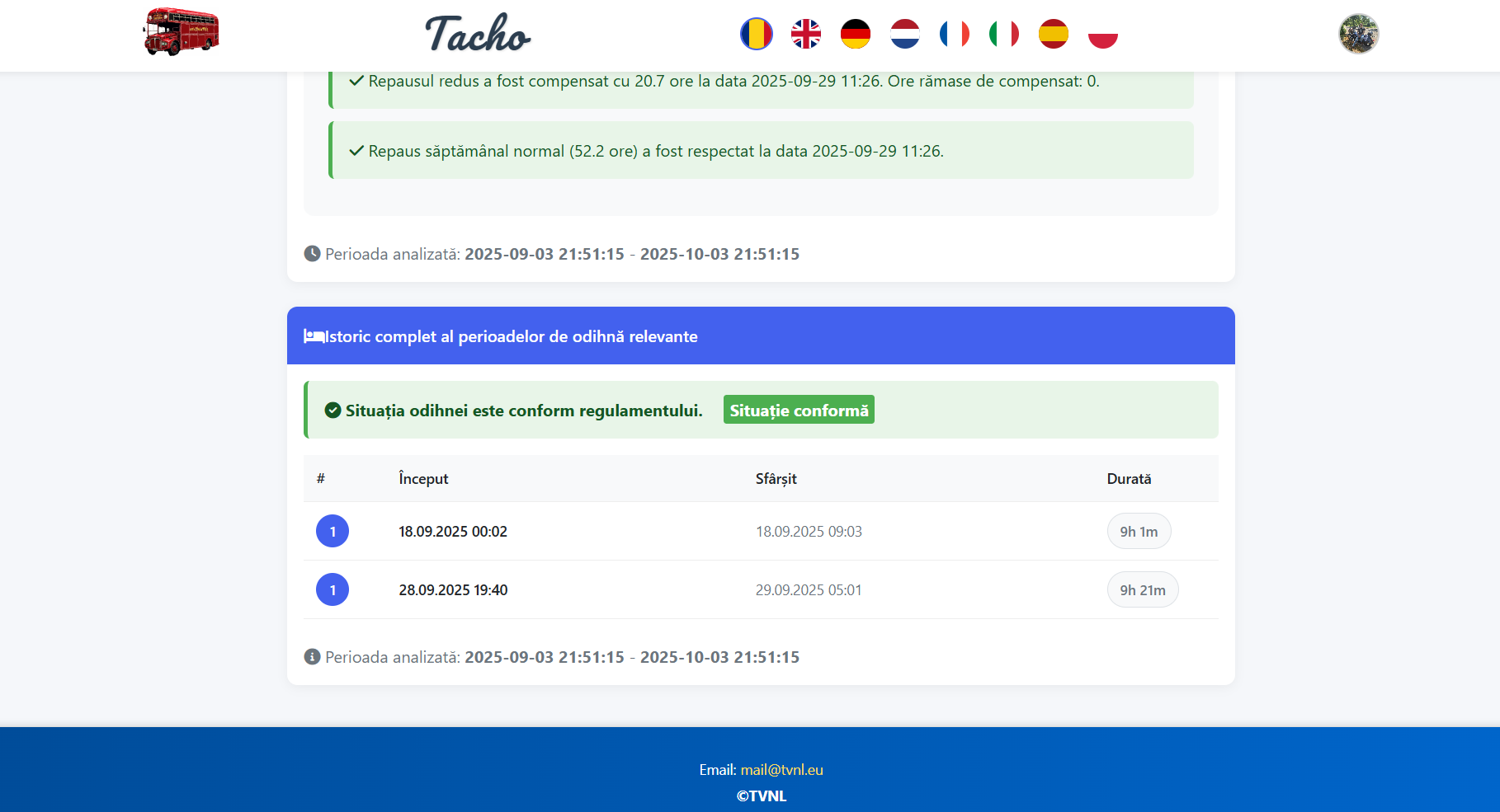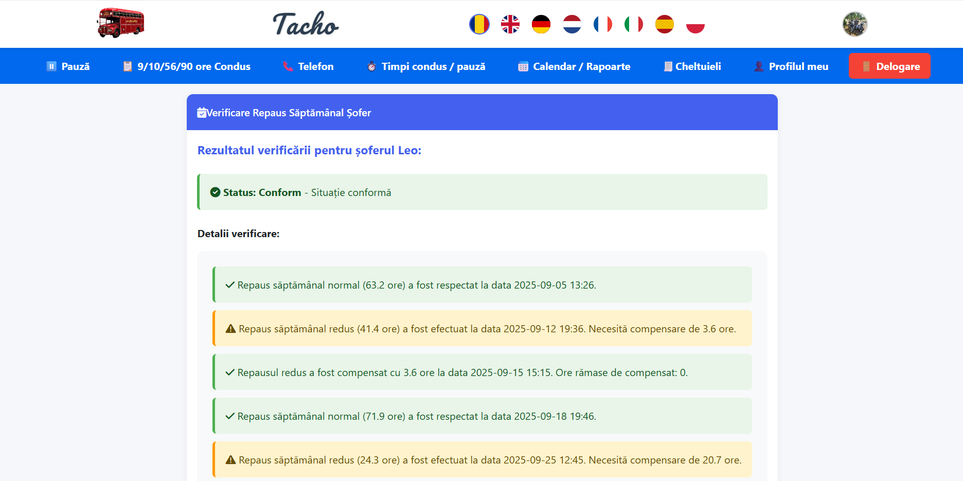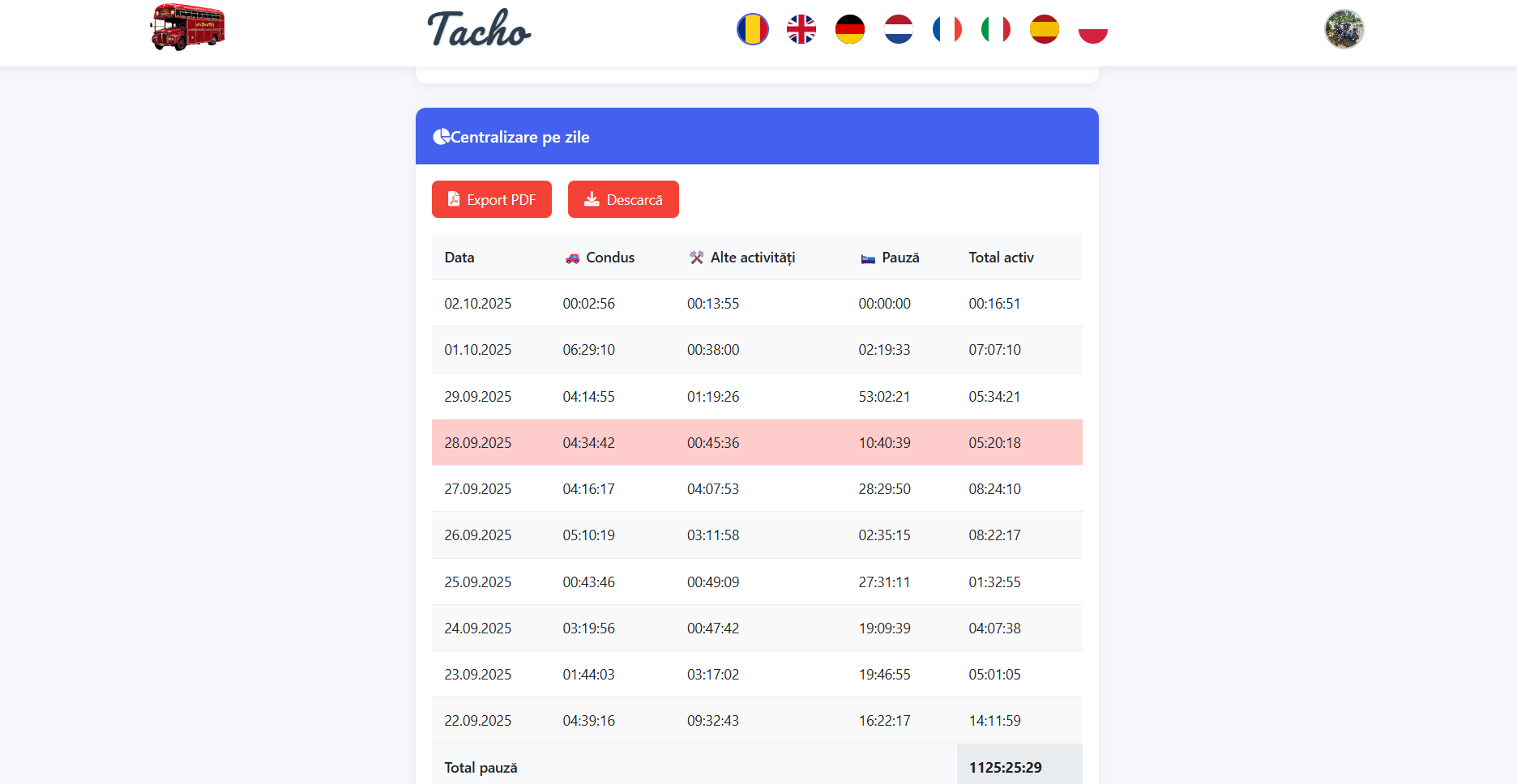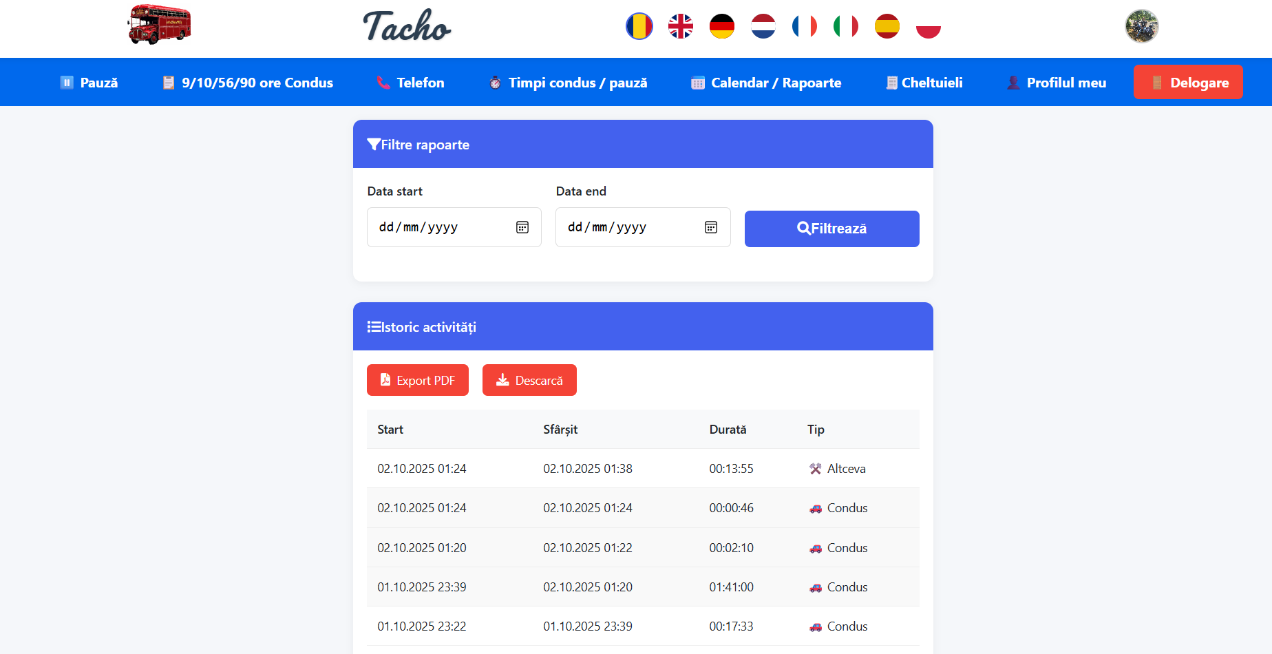Această aplicație este destinată șoferilor profesioniști și companiilor de transport care doresc să gestioneze eficient timpii de condus, pauză și alte activități zilnice.
