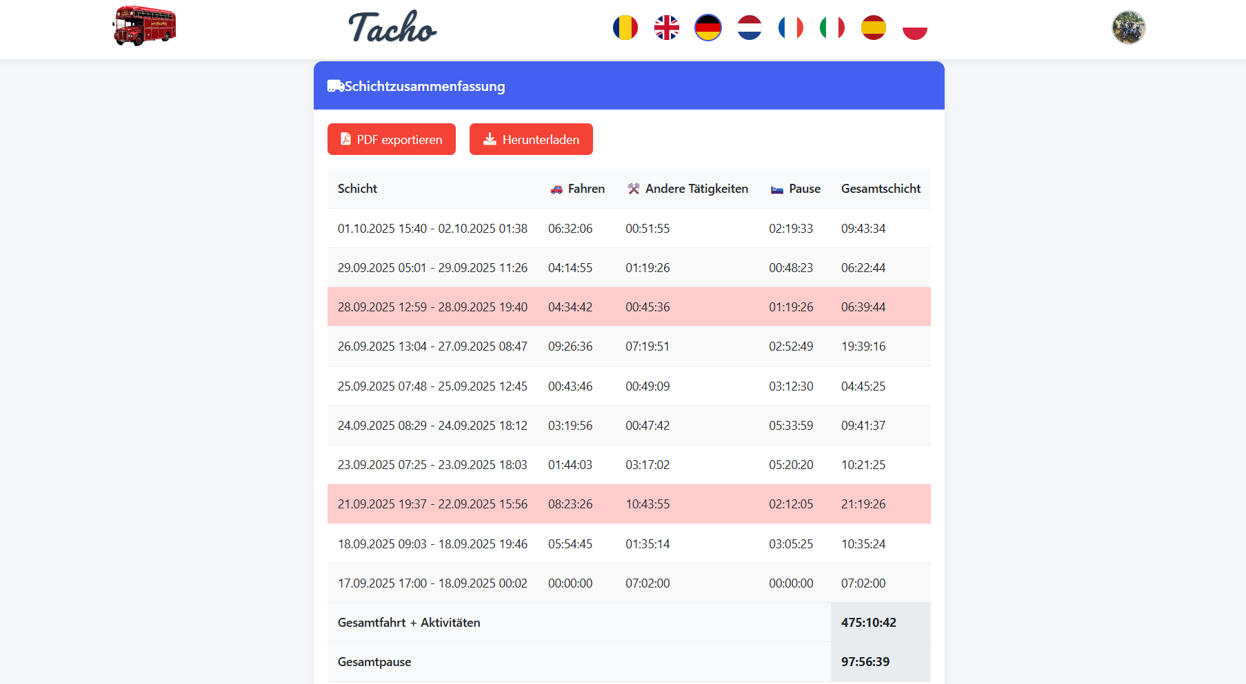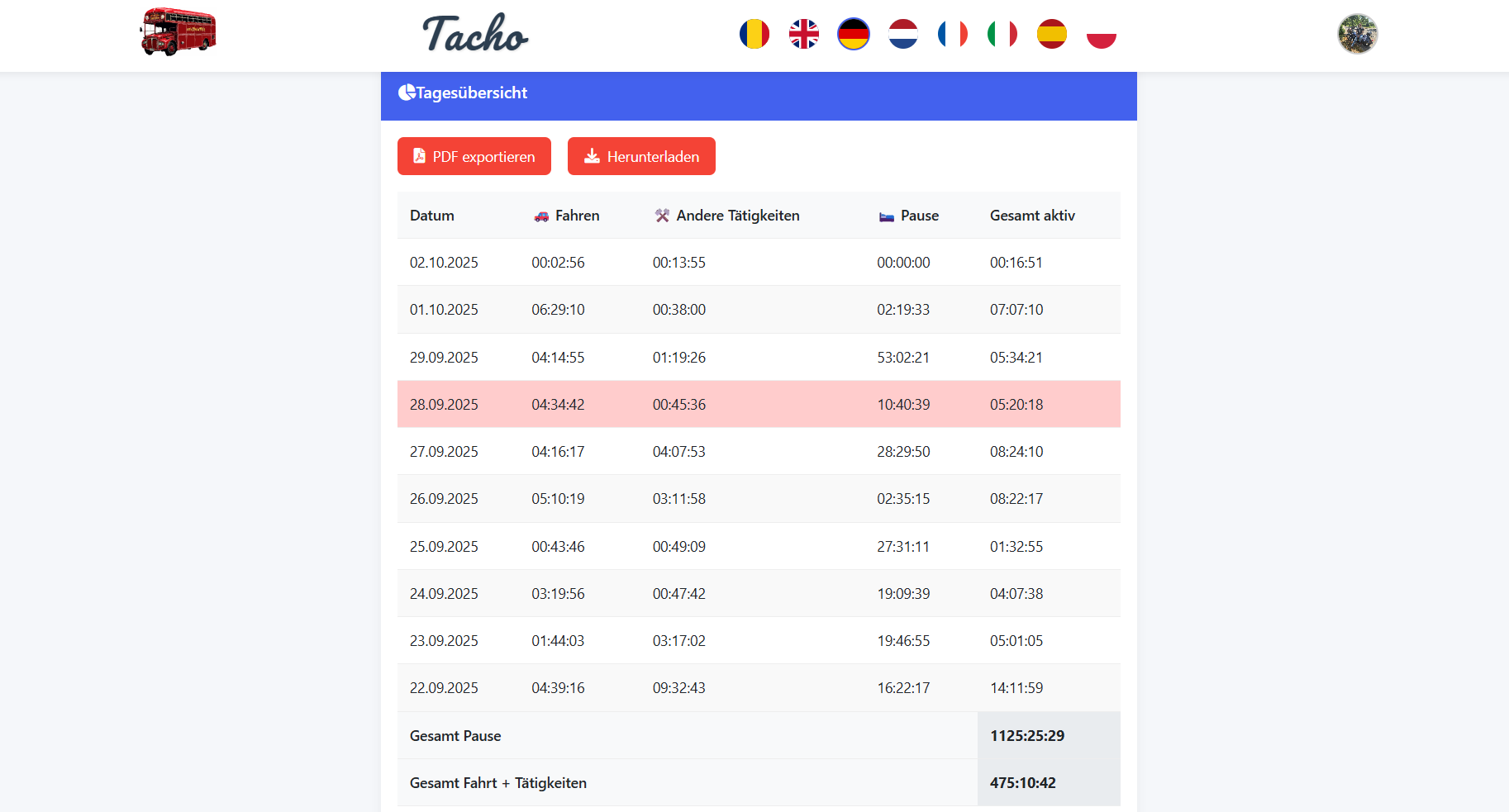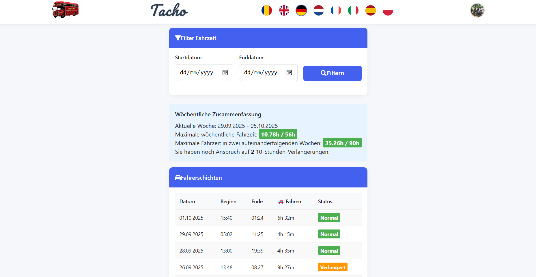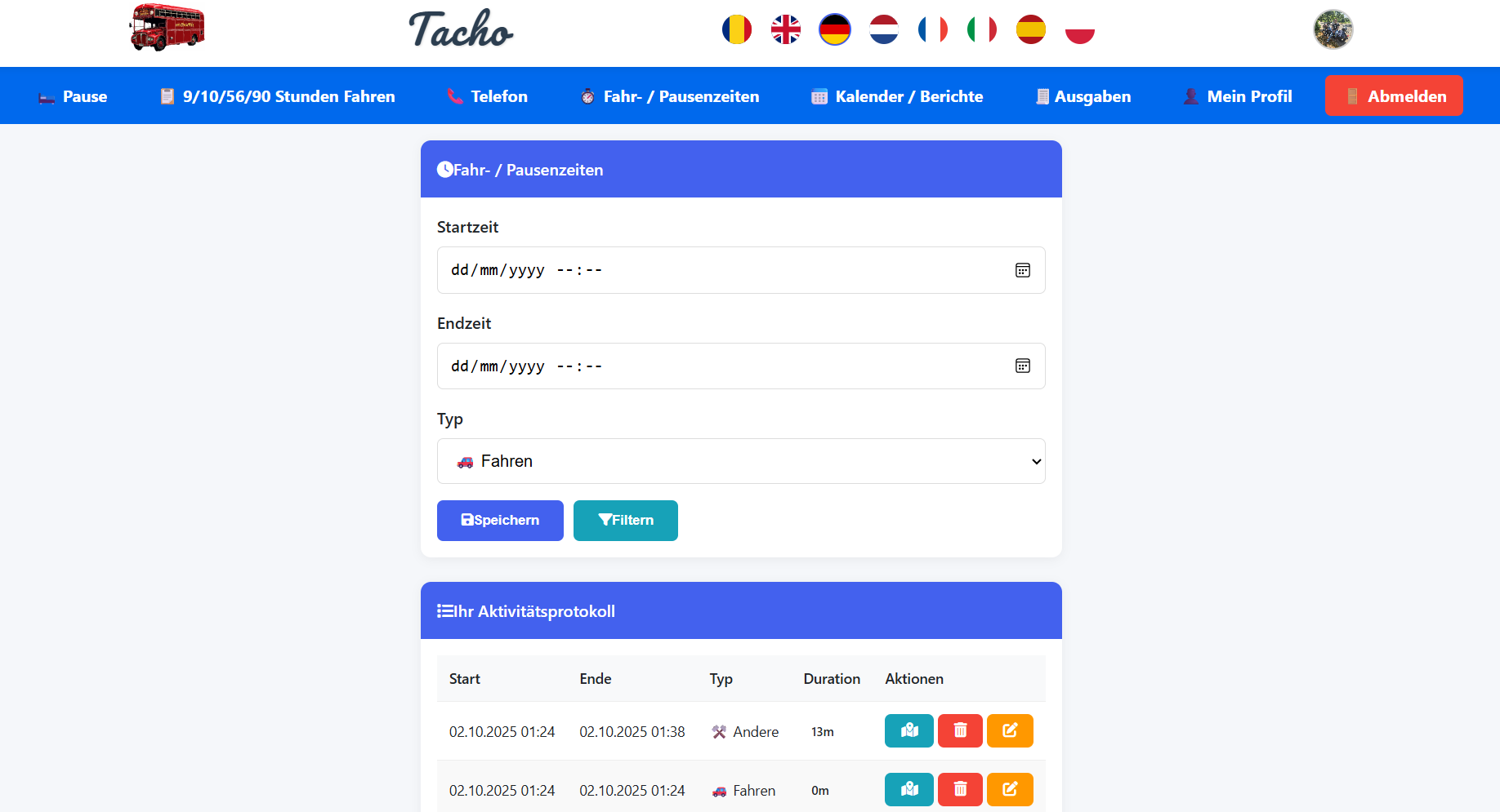 Diese Anwendung richtet sich an Berufskraftfahrer und Transportunternehmen, die ihre Lenkzeiten, Pausen und täglichen Aktivitäten effizient verwalten möchten.