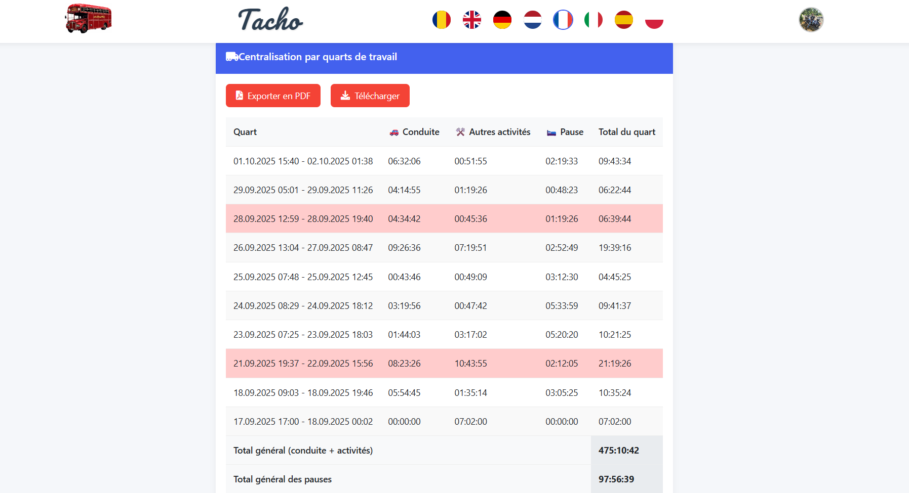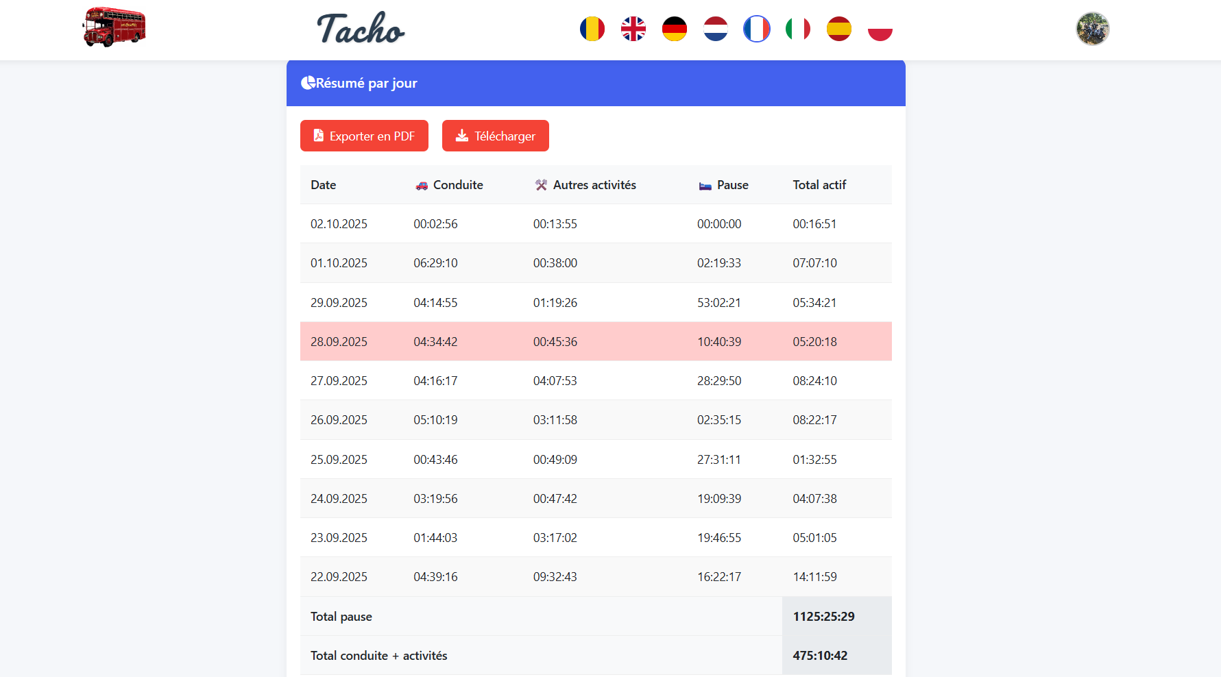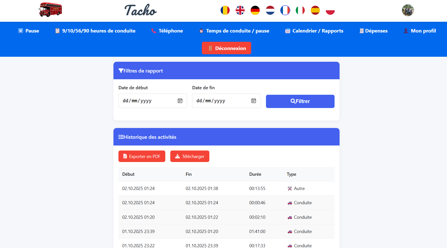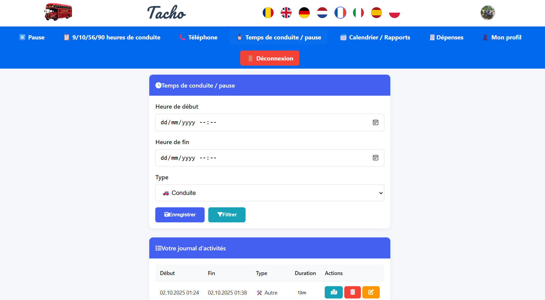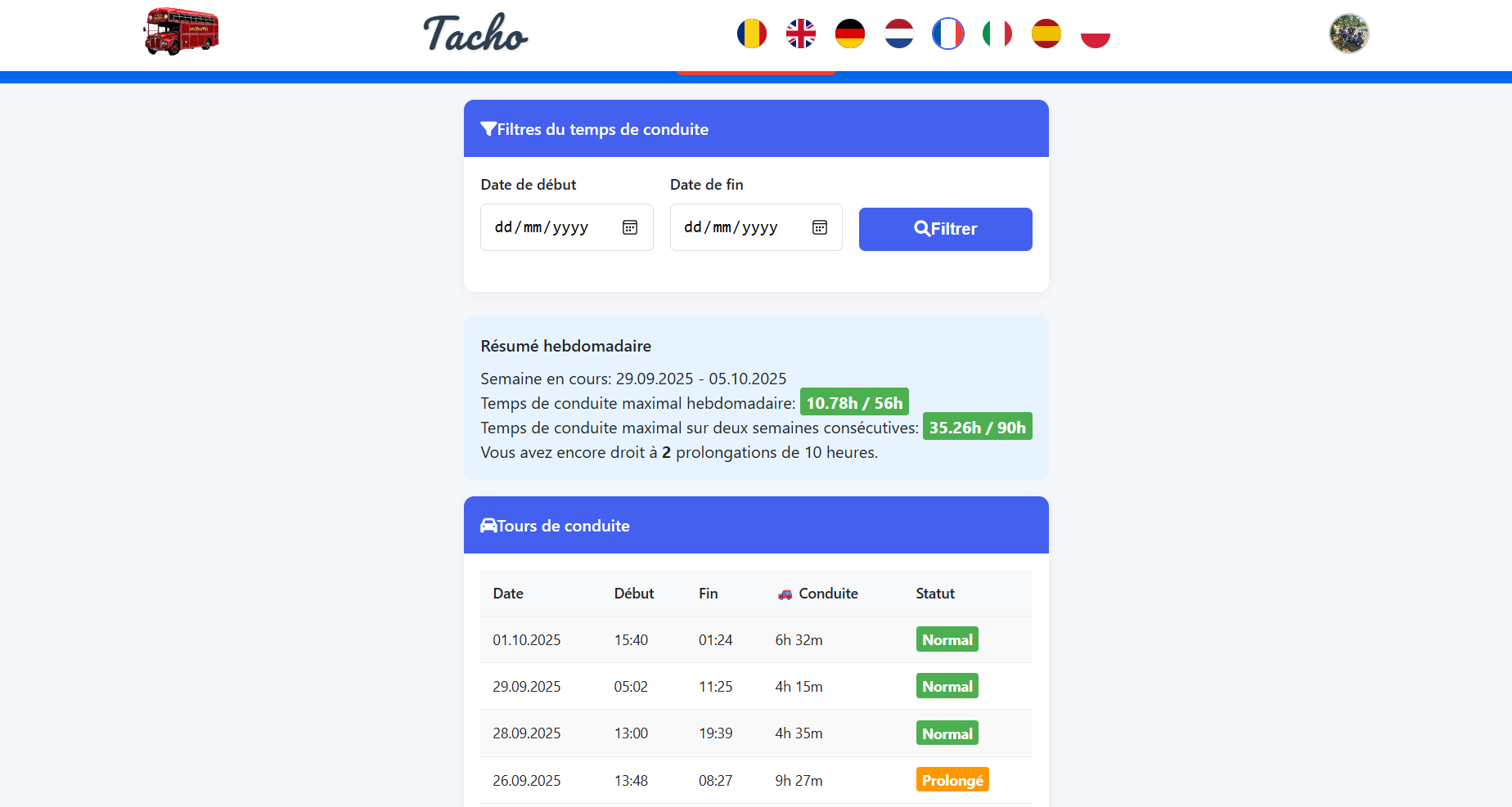 Cette application est destinée aux conducteurs professionnels et aux entreprises de transport qui souhaitent gérer efficacement les temps de conduite, les pauses et les activités quotidiennes.