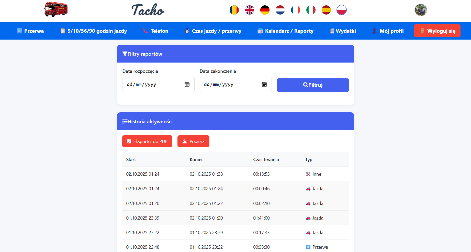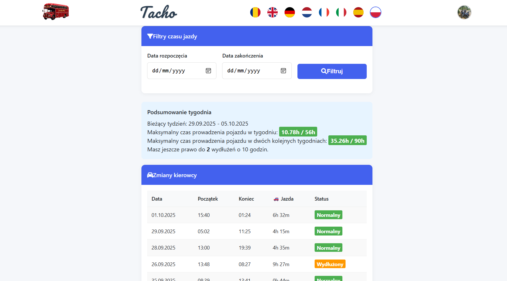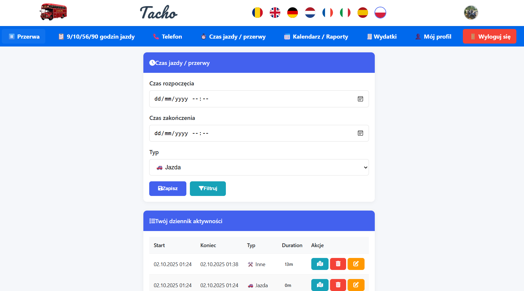 Ta aplikacja jest przeznaczona dla kierowców zawodowych i firm transportowych, które chcą efektywnie zarządzać czasem jazdy, przerwami i codziennymi czynnościami.