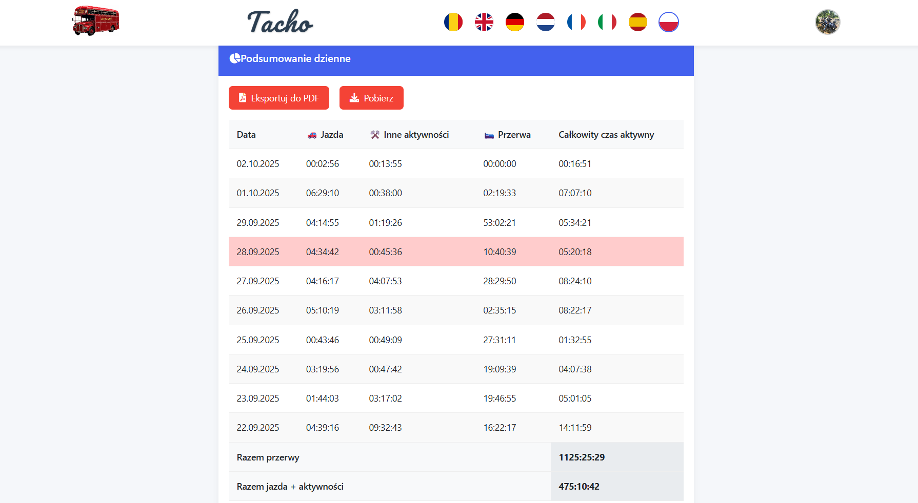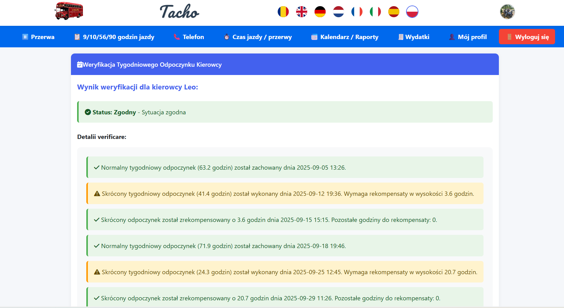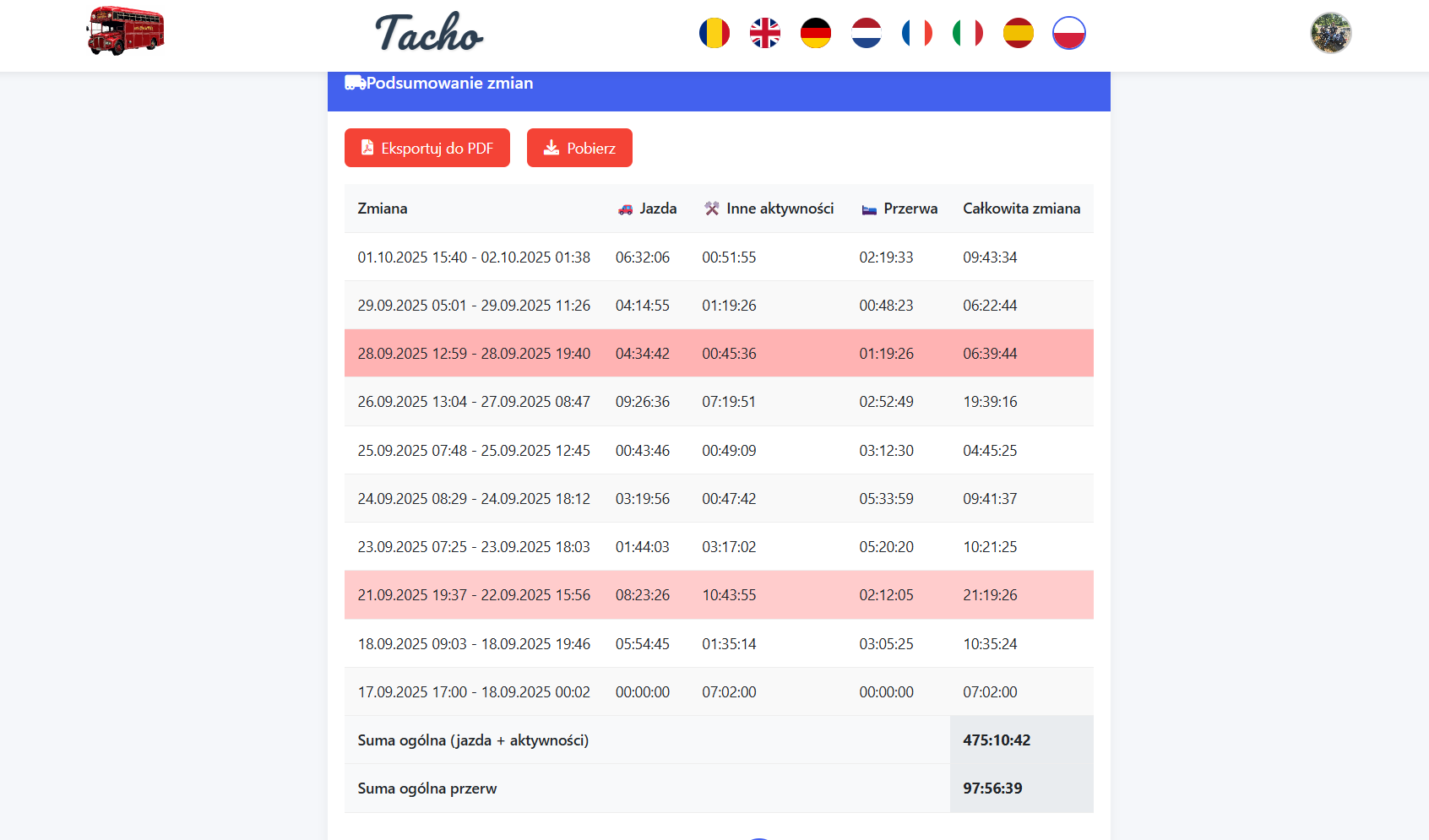 Ta aplikacja jest przeznaczona dla kierowców zawodowych i firm transportowych, które chcą efektywnie zarządzać czasem jazdy, przerwami i codziennymi czynnościami.